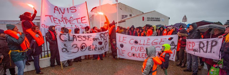 Avec le même effectif d'élèves mais 31h d'enseignement par semaine supprimées, les enseignants du collège des Sicardières, parents d'élèves et élus ont lancé ce mardi 29 janvier 2019 l'opération "Gilets de sauvetage".